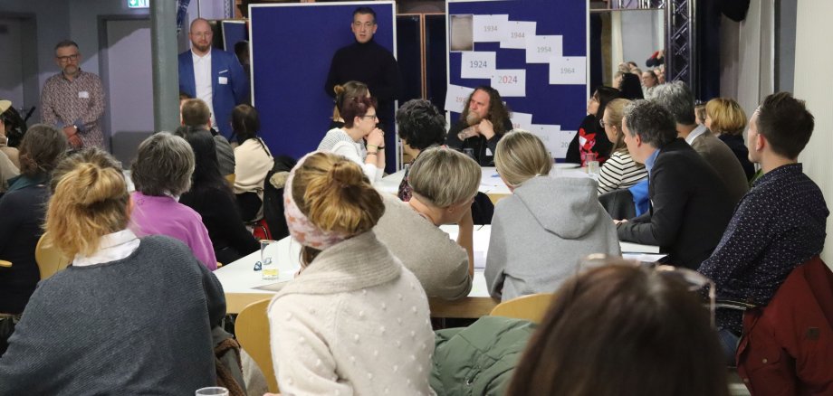 Foto: Viele Kooperationspartner des Amtes für Kinder und Jugend begrüßten OB Emanuel Letz und Amtsleiter Marvin Jung (Mitte, stehend) beim "World-Café" in der Mühle. Links hinten Adrian Kroll, stellv. Leiter Jugendzentrum.