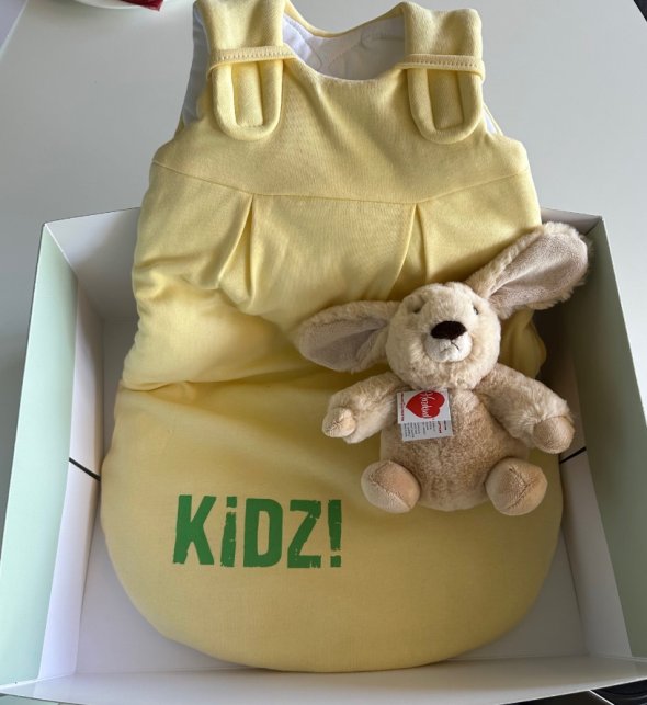 Das Paket enthält einen hochwertigen Babyschlafsack, ein Kuscheltier, eine persönliche Grußkarte, eine Dose Kaufmann’s Haut- und Kindercreme und Informationsmaterialien.