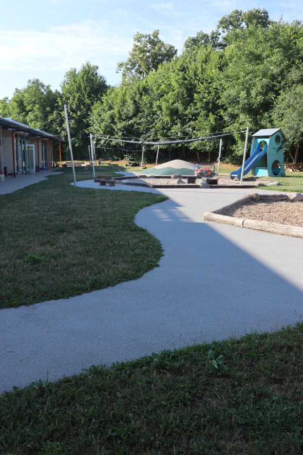Das Außengelände ist sehr groß und umschließt die Kita. Dort haben die Kinder die Möglichkeit bei Wind und Wetter ihrem Bewegungsdrang nachzukommen. Eine Besonderheit ist ein kleines Waldstückchen auf dem Gelände, das die Kinder mit Vorliebe nutzen.