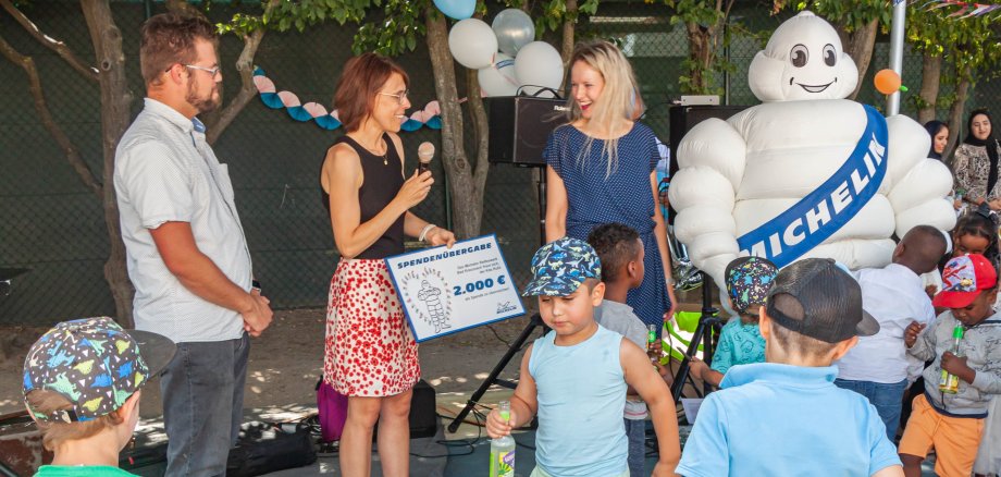 Foto: Auch auf der Sommerfest-Bühne der Kita „RuDi“ hatten alle Akteure viel Freude: Christian Husch vom Förderverein, Kita-Leiterin Silke Behrend mit der Spende über 2000 Euro, Michelin Personalleiterin Heike Notzon und der ständig von Kindern umringte Michelin Mann (von links). Foto: Ulrike Dalheimer/Michelin