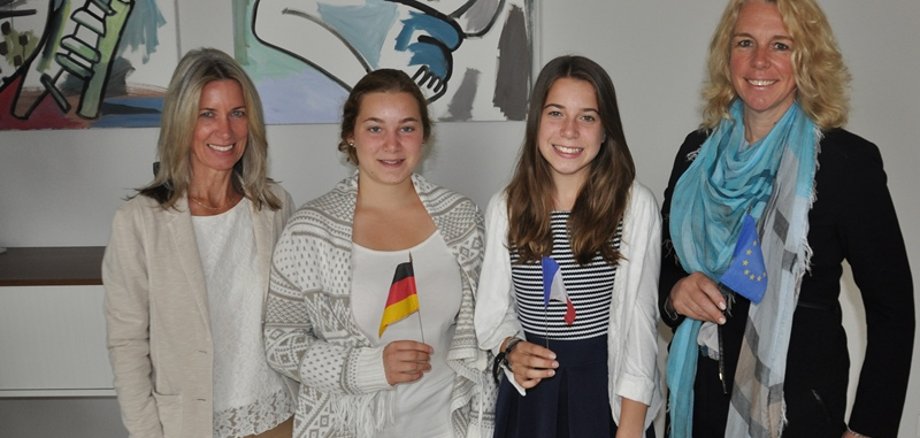 Foto: Den Jugendaustausch für ein starkes Europa fördern: Maëlle Bertrand (2..v.l) und Joleen Simmich zu Besuch bei Oberbürgermeisterin Dr. Heike Kaster-Meurer. Links Christine Simmich.