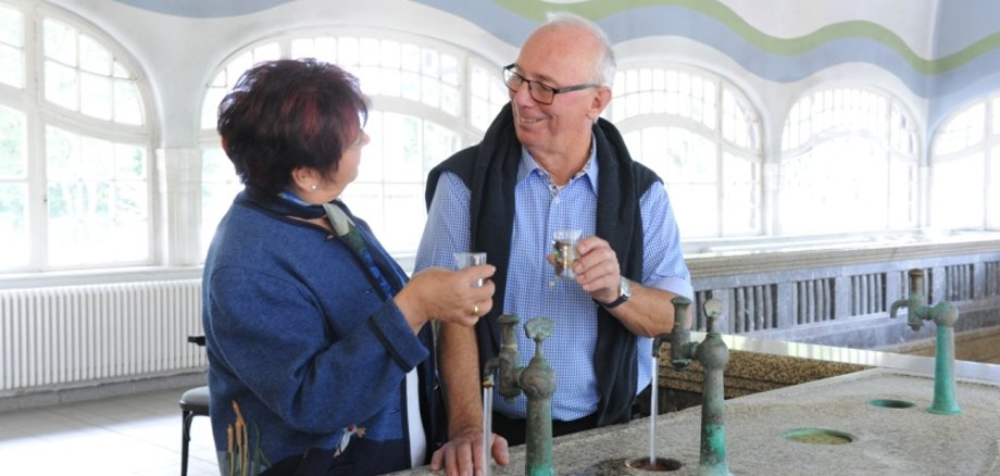 Foto: Die Eheleute Weyl beim Genuss des Heilwassers der Rheingrafenquelle.