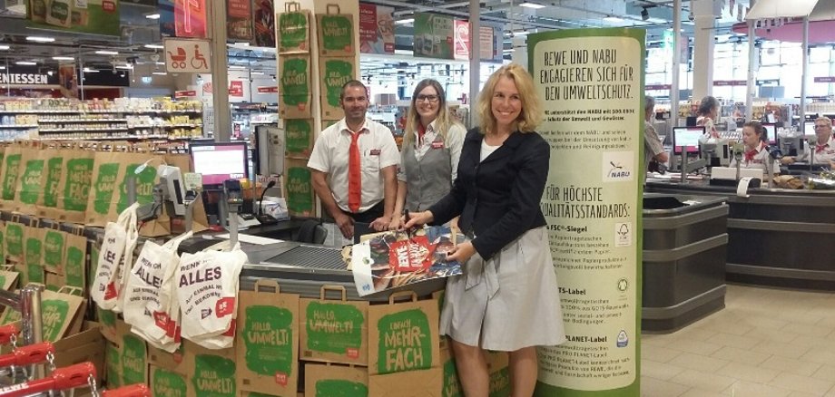 Für Kunden, die an der Kasse eine Tragehilfe für den Einkauf benötigen, stehen in den REWE-Märkten mehrfach wiederverwendbare Alternativen zur Auswahl wie
