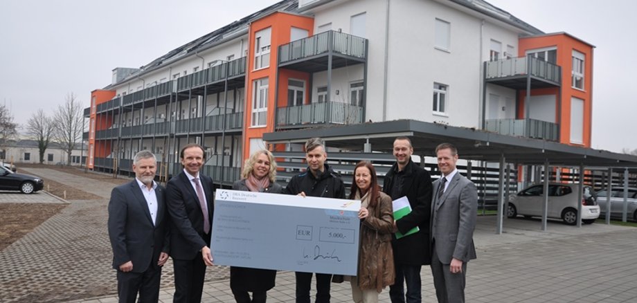 Foto: BKEG-Geschäftsführer Dietmar Canis, Bauwertvorstand Uwe Birk, OB Dr. Heike Kaster-Meurer, Marc Kluschat und Ursula Lubitz (Leitung Musikschule Mittlere Nahe), BKEG-Stadtplaner Thomas Geissler und Thorsten Bartl, Leiter Vertriebsmanagement Bauwert Wiesbaden vor Haus 5 der Anheuser Höfe.
