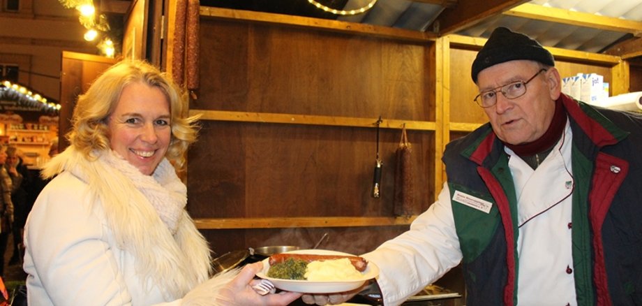 Dazu gehörten Peter Scholten, Vorstandsvorsitzender der Sparkasse Rhein-Nahe, Karl-Heinz Seeger, Geschäftsführer der Gewobau und Ulrike Dalheimer, Leiterin Standortkommunikation Michelin Bad Kreuznach. Mit den Köchen nach Bad Kreuznach kamen auch Maja Peers (neue Museumsleiterin) und Magdalena Yanshin (neue Mitarbeiterin, zuständig für Städtepartnerschaften). Sie wurden von Christine Simmich (Städtepartnerschaften) und dem Leiter des Schloßparkmuseums und der Römerhalle, Marco van Bel, herzlich begrüßt. Über eine deftige Portion freute sich auch Oberbürgermeisterin Dr. Heike Kaster-Meurer, die sie vom Neuruppiner Koch Ulrich Gaebler gereicht bekam (Foto). Das Köcheteam aus der Bad Kreuznacher Partnerstadt wird durch Eleonore Gaebler, Erika Franke, Sandro Gronau und Norbert Schmock komplettiert.