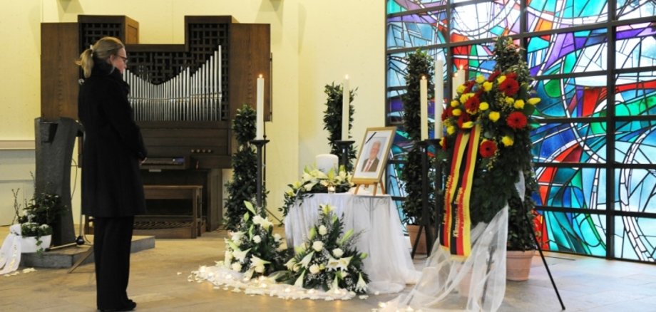Foto: Abschied von Eike Mildner. Oberbürgermeisterin Dr. Heike Kaster-Meurer vor dem Porträtfoto des Bad Kreuznacher Bürgers, der Opfer des Terroranschlages am 12. Januar in Istanbul wurde.