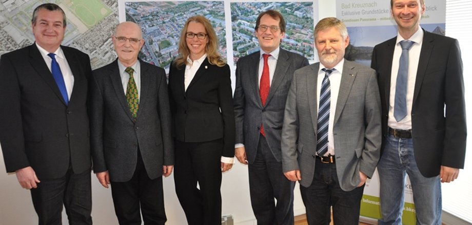 Foto: Sie ziehen zum 10. Geburtstag der BKEG eine überaus positive Bilanz: Rolf Riecker (BKEG-Projektleiter), Werner Fuchs (BKEG-Beiratsvorsitzender), Oberbürgermeisterin Dr. Heike Kaster-Meurer, Sparkassen-Vorstandsvorsitzender Peter Scholten, BKEG-Geschäftsführer Dietmar Canis und Thomas Geissler (Architekt und Stadtplaner der BKEG).