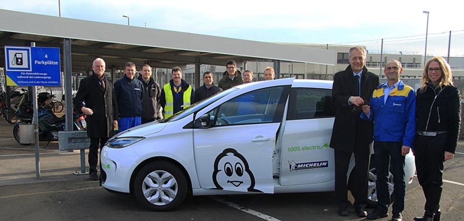 Foto: An der „Stromtankstelle“: Werkdirektor Christian Metzger (3. v. r.) übergibt in Anwesenheit von Oberbürgermeisterin Dr. Heike Kaster-Meurer (r.) symbolisch den Schlüssel des neuen Elektrofahrzeugs an Michael Kobylarz (2. v. r.), der das Auto für Dienstfahrten in der Region nutzen wird. Hinter dem Auto: Personalleiter Peter Kubitscheck (l.), Betriebsratsvorsitzender Muharrem Kaya (5. v. l.) und Mitglieder der Michelin Arbeitsgruppe „50 Jahre Michelin in Bad Kreuznach“.