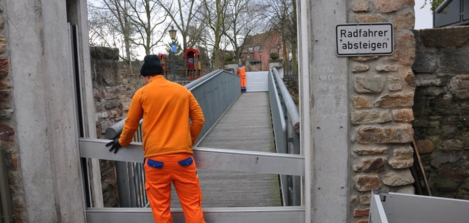 Von fallenden Wasserständen überzeugten sich auch Bauhofleiter Hans Kaluza und die Leiterin der Abteilung für Tiefbau und Grünflächen, Corinna Peerdeman, gegen 10 Uhr vor Ort in der Magister-Faust-Gasse. Dort wurden dennoch vorbeugend die Zugänge des Eisernen Steges mit Schutzbalken verschlossen. Bis in die Nacht hatten 10 Mitarbeiter des Bauhofes (weitere neun waren in Bereitschaft) die Durchgänge an den Hochwasserschutzbauten der Aufbaustufe I (vorbeugend nach Eröffnungsmeldung) und Aufbaustufe II (5,50 Meter mit Tendenz steigend), die bereits im November vergangenen Jahres montiert wurden, verschlossen und die Schieber an den Gradierwerken im Salinental kontrolliert. Die LKW waren mit den Schutzelementen der Aufbaustufe III (sechs Meter Tendenz steigend) vorsorglich beladen worden. Die Zufahrten zum Wertstoffhof und zur Kläranlage sind wegen Überflutung nicht möglich.