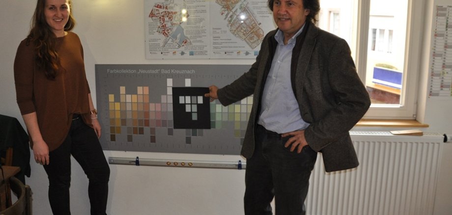 Foto: Rainer Schmitt und Olga Mauer geben bei der Umsetzung der neuen Gestaltungssatzung auch Tipps zur Farbgebung.