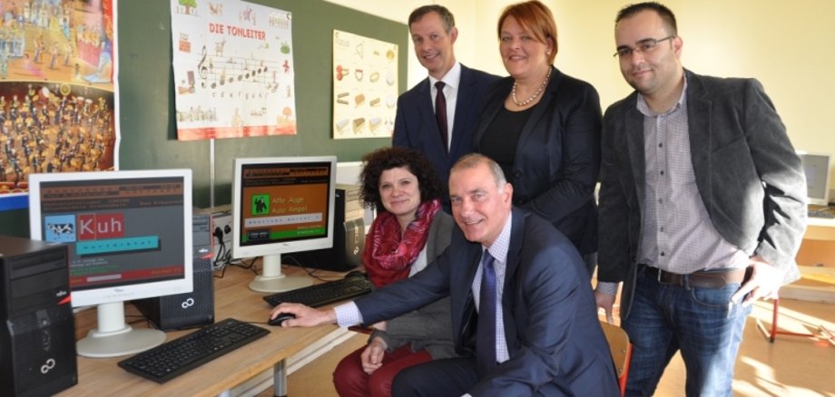 Foto:Den Schülerinnen und Schülern viel Spaß an den neuen Computern wünschen: Schulleiterin Britta Gläser, Rainer Schug (URANO) vorne sitzend. Schuldezernent Udo Bausch, Amtsleiterin Gritt Gigga und Gökhan Demirdag (URANO), für die Betreuung der Schule zuständig.