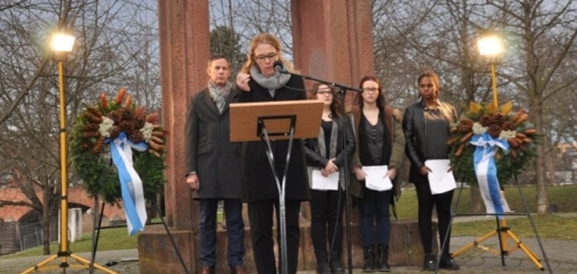 71 Jahre nach dem Zweiten Weltkrieg „können wir als Europäer mit Stolz auf den zurückgelegten Weg der Demokratie schauen. Heute stehen wir vor der Herausforderung, unsere Werte zu verteidigen“, so die OB. Dazu zählt insbesondere der Schutz von Minderheiten, sagte sie vor dem Hintergrund des erstarkenden Rechtsradikalismus in Deutschland und beklagte dabei die zunehmenden anti-jüdischen Übergriffe, von Synagogenbränden bis zu Schikanen jüdischer Kinder an staatlichen Schulen. An die Schüler gewandt appellierte sie: „Ich wünsche mir, dass Ihr mit Euren Lehrern erfahrt und begreift, was Auschwitz bedeutet, und dass Ihr über das, was Auschwitz uns lehrt, nachdenkt. Morgen werdet Ihr die Bürger sein, die Verantwortung dafür tragen, dass alles, was erneut zu einer solchen Verkettung von Hass und Gewalt führen könnte, verhindert wird.“