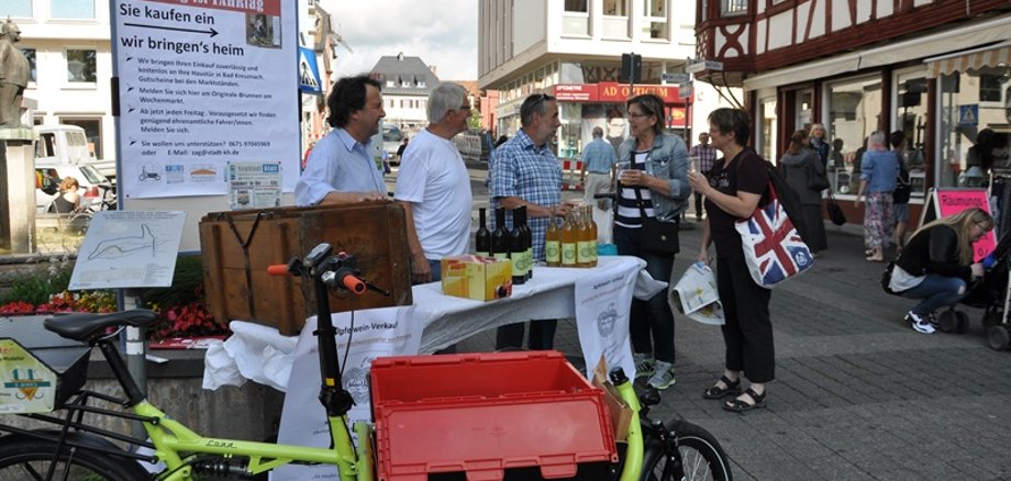 Foto: Rainer Schmitt (Stadtteilbüro zag), Klaus Kahlstadt und Pitt Elben (beide Initiative Lastenrad) beim Verkauf des Apfelweins.