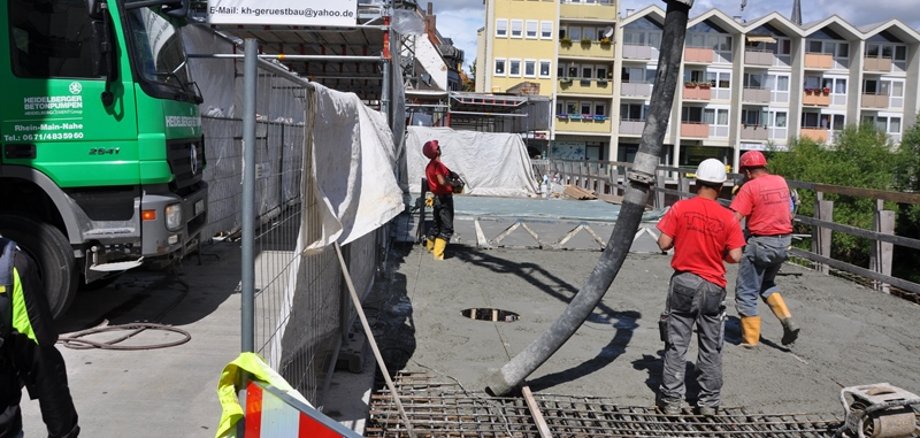 Foto: Hochbetrieb auf der Baustelle, hier beim Betonieren des Fahrbahnbelages auf der Nahebrücke. 25 Leute sind auf beiden Brückenbaustellen im Einsatz.