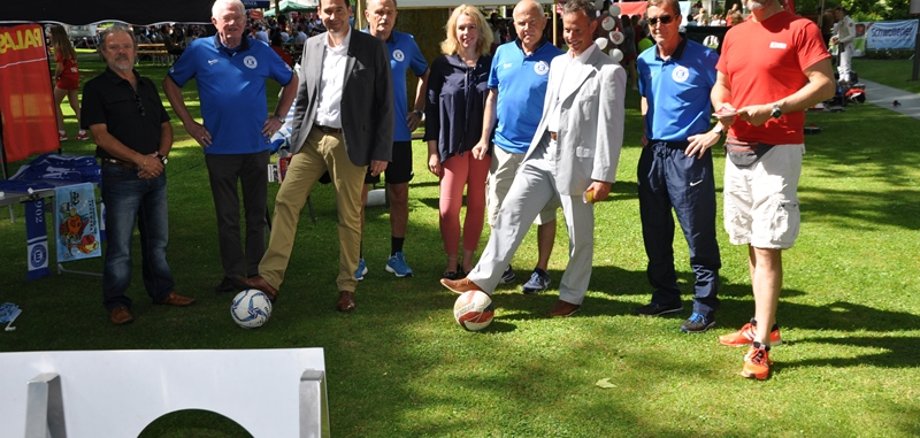 Foto: Viele Tore wünschen Oberbürgermeisterin Dr. Heike Kaster-Meurer und Sportdezernent Udo Bausch (am Ball) dem Fußballverbandsliga-Aufsteiger SG Eintracht Bad Kreuznach. Auf dem Foto: SGE-Marketingleiter Heinz Dietrich, Schriftführer Edgar Breid, stellv. Vorsitzender Hermann Holste, stellv. Vorsitzender Olli Holste und Thorsten Schmidt, Antenne-Geschäftsführung (v.l.n.r.), vorne links am Ball Jörg Brendel (Sparkasse Rhein-Nahe)