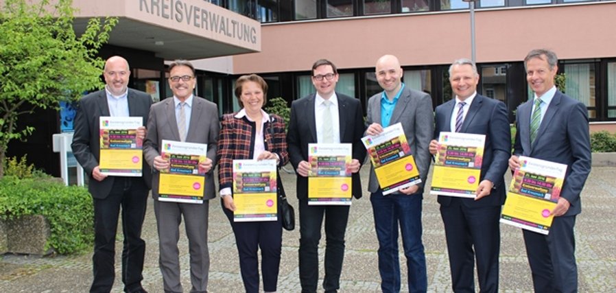 Foto von Torsten Strauß: Thomas Braßel (Geschäftsführer der Wirtschaftsförderung im Landkreis Bad Kreuznach), Landrat Franz Josef Diel, Andrea Rosenberg (Leiterin Gewerbekunden der Volksbank Rhein-Nahe-Hunsrück), Mirko Syré (Sprecher der Wirtschaftsjunioren Bad Kreuznach), Tobias Dech (Leiter der Steuerungsgruppe), Alexander Schmitt (Vertriebsleiter Firmenkunden der Sparkasse Rhein-Nahe) und der Bad Kreuznacher Beigeordnete Udo Bausch