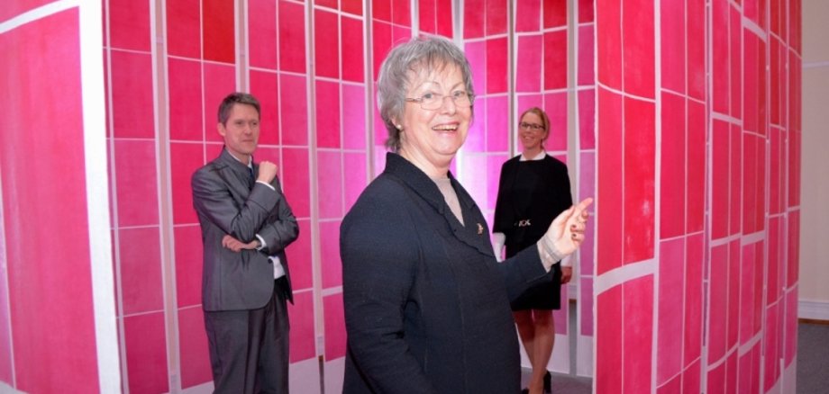 Foto: Die Rauminstalllation "In der Schwebe" schuf die Künsterlin und Kunstpreisträgerin Katharina Fischborn (Bildmitte) speziell für das Schloßparkmuseum. Von der Ausstellung "INNERE ARCHITEKTUREN" sind auch Museumsdirektor Marco van Bel sowie Oberbürgermeisterin und Kulturdezernentin Dr. Heike Kaster-Meurer sehr begeistert .