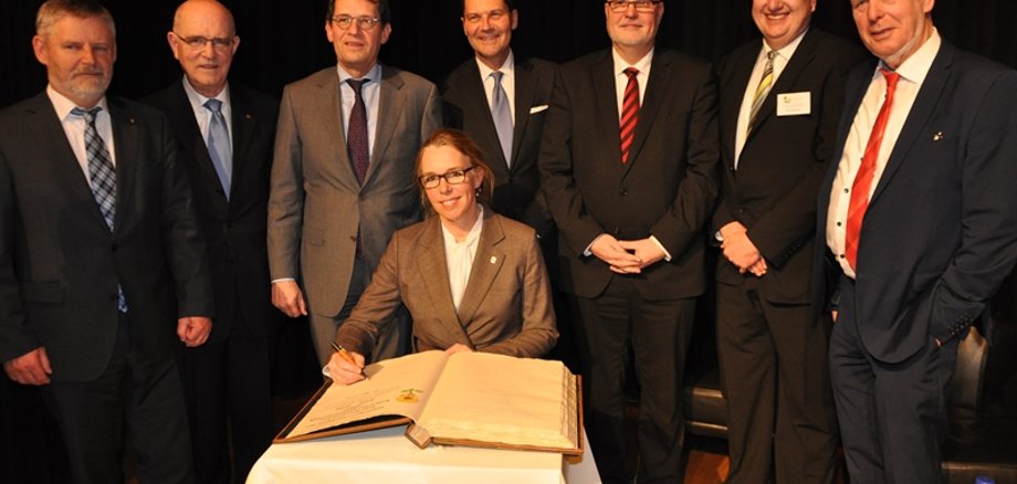 Foto: Zehn Jahre BKEG. Die Erfolgsgeschichte ist nun auch im Eisernen Buch der Stadt Bad Kreuznach verewigt: Nach Dr. Heike Kaster-Meurer trugen sich mit weiteren Persönlichkeiten ein: Dietmar Canis, Werner Fuchs, Peter Scholten, Frank Berlepp, Jürgen Katz, Rolf Riecker und Carsten Pörksen.