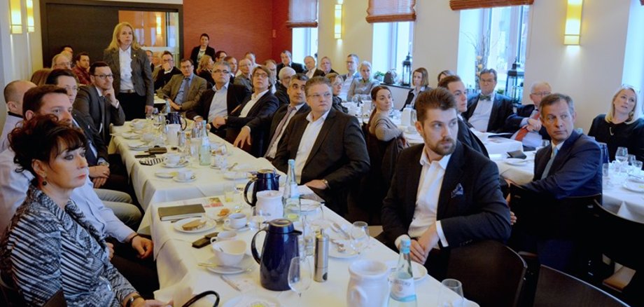 Beim „Fachgespräch Immobilienwirtschaft“ im Hotel-Restaurant Mühlentor tauschten Oberbürgermeisterin Dr. Heike Kaster-Meurer (stehend) und Wirtschaftsdezernent Udo Bausch wertvolle Informationen mit Repräsentanten der regionalen Immobilienwirtschaft aus. Foto: KruppPresse