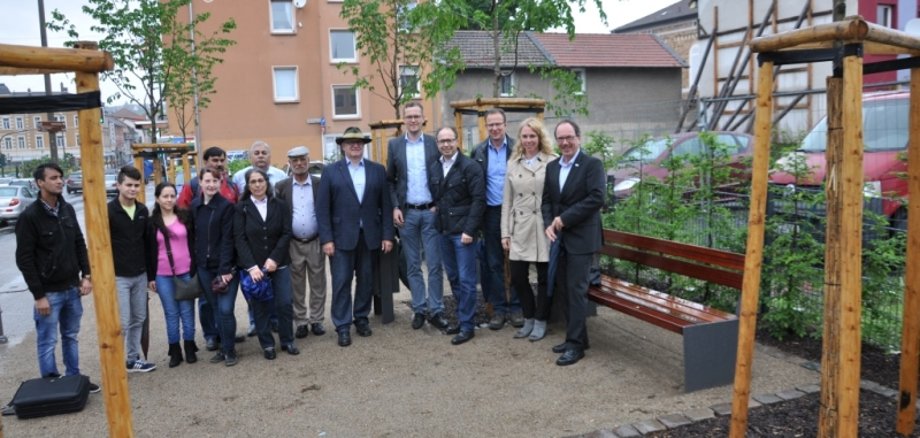 Foto: Oberbürgermeisterin Dr. Heike Kaster-Meurer (2.v.r.) und Hans Sifft (3.v.r.) mit Repräsentanten der Sponsoren Beinbrech, Verheyen-Ingenieure, Kreuznacher Stadtwerke, und der Ahmadiyya Muslim Jamaat Gemeinde sowie dem Stadtteilverein „Pariser Viertel“ und dem Quartiersmanagement.