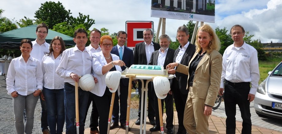 Foto: Die "Spatenstichtorte" schnitten Jutta Krewenka (6.v.l.) und Oberbürgermeisterin Dr. Heike Kaster-Meurer an.