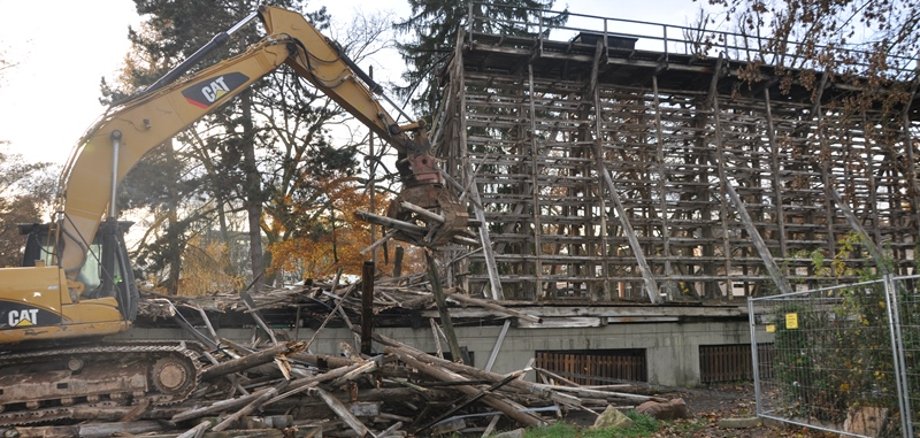 Foto: Zwei Drittel der morschen Holzkonstruktion der Saline Ost wurden bereits am ersten Tag abgerissen