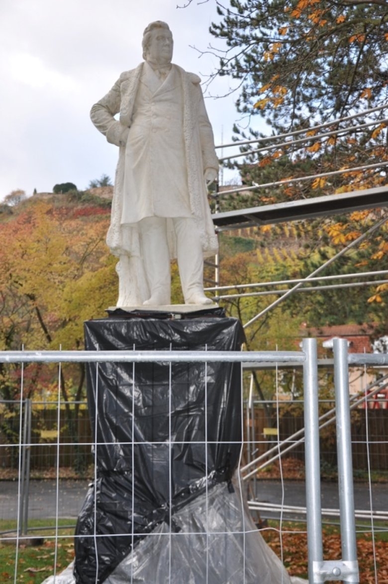 Voraussichtlich Ende November/Anfang Dezember werden die Restaurierungsarbeiten am Sandsteinsockel fortgesetzt. Für die Verarbeitung des Restaurierungsmörtels ist eine Mindesttemperatur von plus 5 Grad Celsius erforderlich. Zum Schutz vor Wind, Regen und Sonne ist der Sockel mit einer Folie eingehüllt. Das Denkmal Prieger war sehr stark mit Flechten- und Moosbewuchs verschmutzt, in Folge des Verwitterungsprozesses war die Marmoroberfläche stark ausgewaschen und verfärbt, es gab Abplatzungen und Rissbildungen, außerdem fehlte der vordere Teil der Schriftrolle in der linken Hand. Die Skulptur ist gereinigt, die Schäden beseitigt, das Schriftrollenteil wird nach seiner Rekonstruktion noch montiert.