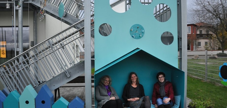 Foto: Vor Wind und Kälte geschützt, machten es sich Heike Kaster-Meurer, Gabi Bruckmann und Dagmar Stephan- Roth im "Kunst am Bau" bequem.
