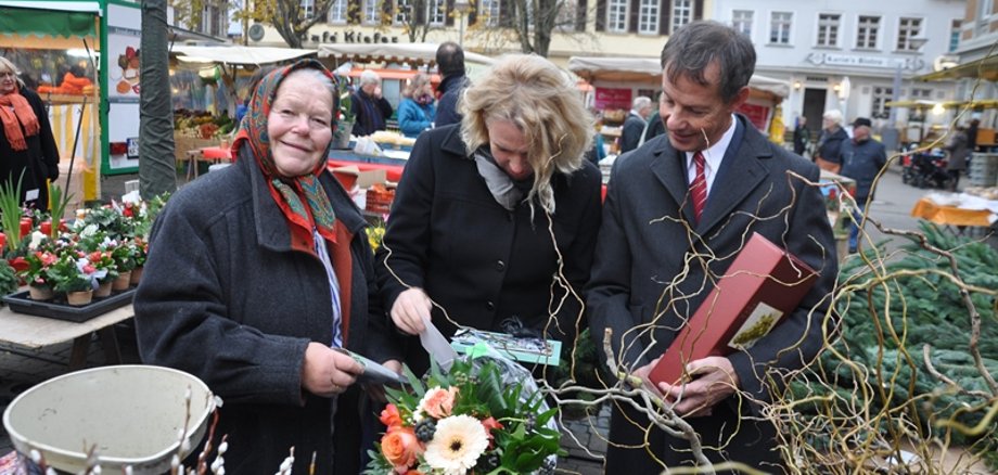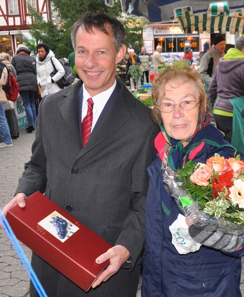 Marktdezernent und Marktfrau: Udo Bausch bedankt sich bei Brigitte Delaveaux