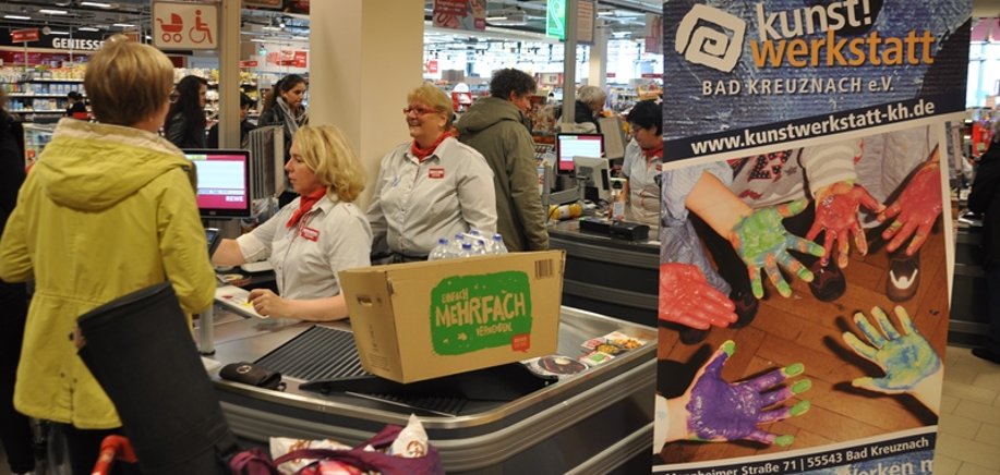 Ein Muskelkater erinnerte die Oberbürgermeisterin einen Tag nach der Aktion an diese schwere Arbeit. „Ich habe eine hohe Achtung vor den Menschen, die das täglich machen und dabei sehr freundlich sind.“ Sie bedankt sich bei Rewe für die Bereitschaft durch diese Aktion die Arbeit der Kunstwerkstatt zu unterstützen. „Wir können uns glücklich schätzen, dass es solch ein tolles Angebot an Kinder und Jugendliche in unserer Stadt gibt“, verweist die OB auf das große ehrenamtliche Engagement in der Kunstwerkstatt. Glücklich über den Geldsegen ist auch Renate Ziegler vom Vorstand der Kunstwerkstatt e.V. „Mit der Spende unterstützen wir unser Jugendteam und können uns endlich den für die Verwaltungsarbeit so notwendigen neuen PC leisten.“