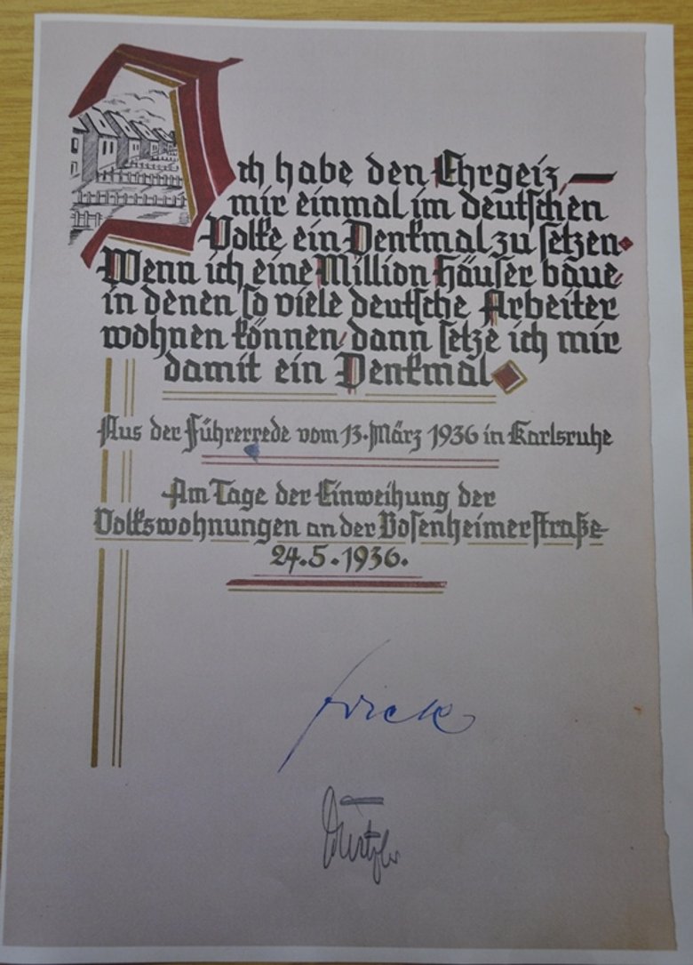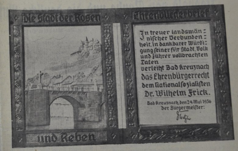 Im Bad Kreuznacher Stadtarchiv kennt sich Joachim Hennig bestens aus. Der pensionierte Richter am Oberverwaltungsgericht Koblenz und Hobby-Historiker war schon häufig dort zu Recherchezwecken Gast, so zum Beispiel für die virtuelle Ausstellung „Hugo Salzmann (1903-1979) – Kommunist – Gewerkschaftler - Künstler aus Bad Kreuznach“, die er 2012 gemeinsam mit der Salzmann Tochter Juliana erarbeitete. Dieses Mal begleitete ihn ein Fernseh-Team der SWR Redaktion Landeskunde. Stadtarchivarin Franziska Blum-Gabelmann hatte interessante Dokumente bereit gelegt. Zeitungsausschnitte, kopierte Seiten aus dem Eisernen Buch, die Einladung zur Einweihung der „Wilhelm-Frick-Siedlung“, Stadtratsprotokolle, alles zum Thema Ehrenbürgerschaft Frick, die ihm 1950 wie jene von Adolf Hitler und dem NS-Reichsbauernführer, Agrarminister und SS-Funktionär Richard Darré wieder aberkannt wurde.