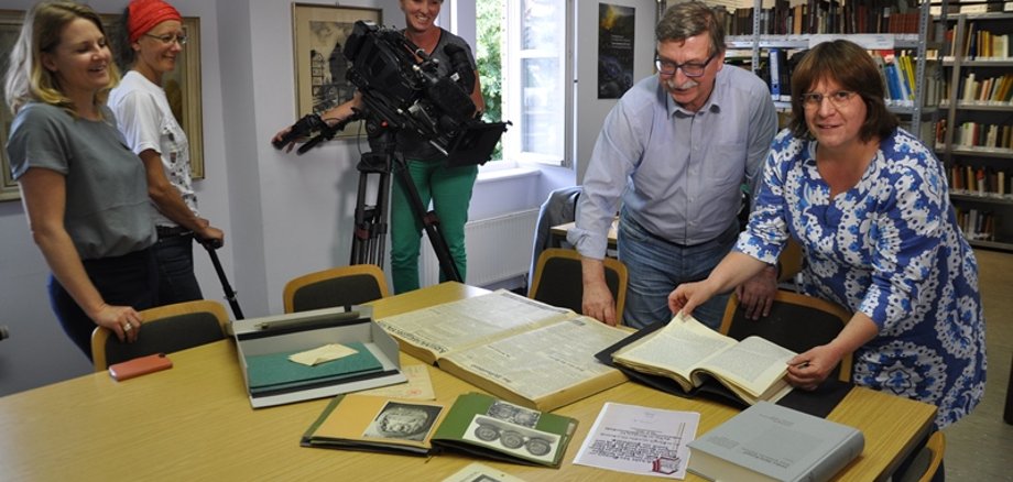 Foto: Stadtarchivarin Franziska Blum-Gabelmann hatte für Joachim Hennig einige Dokumente über den Besuch Fricks in Bad Kreuznach bereit gelegt. Links die SWR-Redakaktionsleiterin Landeskunde, Julia Melan, mit ihrem Team.