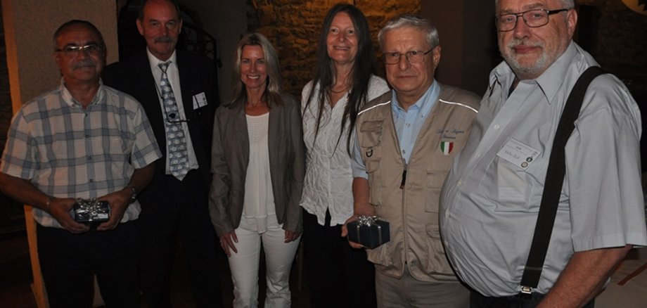 Foto v.l.n.r.: Bernard Cadoz, Präsident der Societe de Tir Bourg-en-Bresse, Hermann Lackas (franz. Übersetzer, Schützengemeinschaft Bad Kreuznach 2014), Christine Simmich, Heidi Rubröder (ital. Übersetzerin, SG Bad Kreuznach), Arnaldo Bicocci, Präsident Tiro a Segno Nationale – Sezione di Parma, und Rolf Müller (1. Vorsitzender SG Bad Kreuznach)