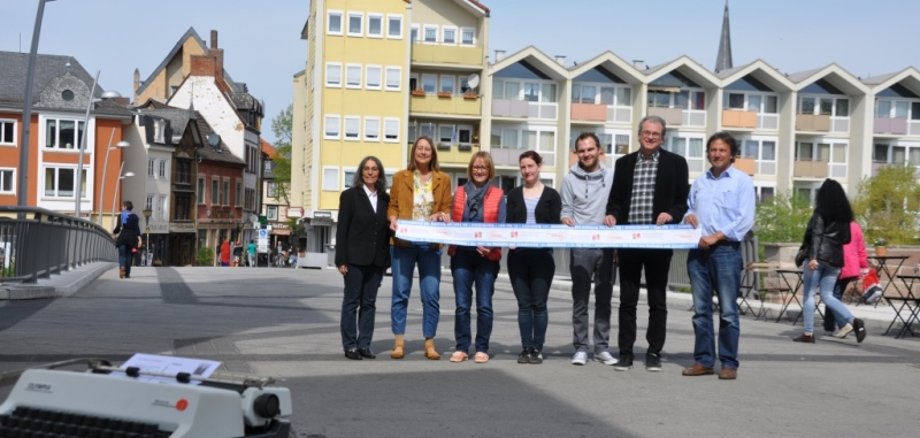 Foto: Nahe(b)rücken ist das Motto einer 20 bis 25 Meter langen Festtafel, die beim Brückenfest gestellt wird. Unter der Federführung von Rainer Schmitt, zag-Büro (rechts), sind u.a. mit den Vorbereitungen befasst: Ibtessam Beidoun (Quartiersmanagerin), Andrea Manz (Weltladen), Beate Bruns (Altstadtverein), Juliane Rohrbacher (Quartiersmanagement), Carsten Schittko (Stadtplanung) und Künstler Gernot Meyer-Grönhoff.