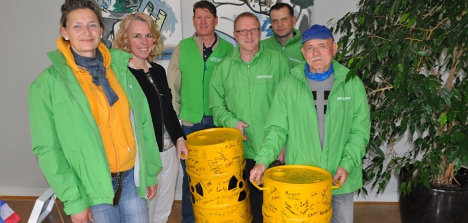 Foto: Unterschriften auf „Atommüllfässern“ überreichten Greenpeace-Mitglieder der Oberbürgermeisterin: Gabriele Rauer, Uwe Brauer, Michael Lohr, Lars Mechinger und Peter Blatt.