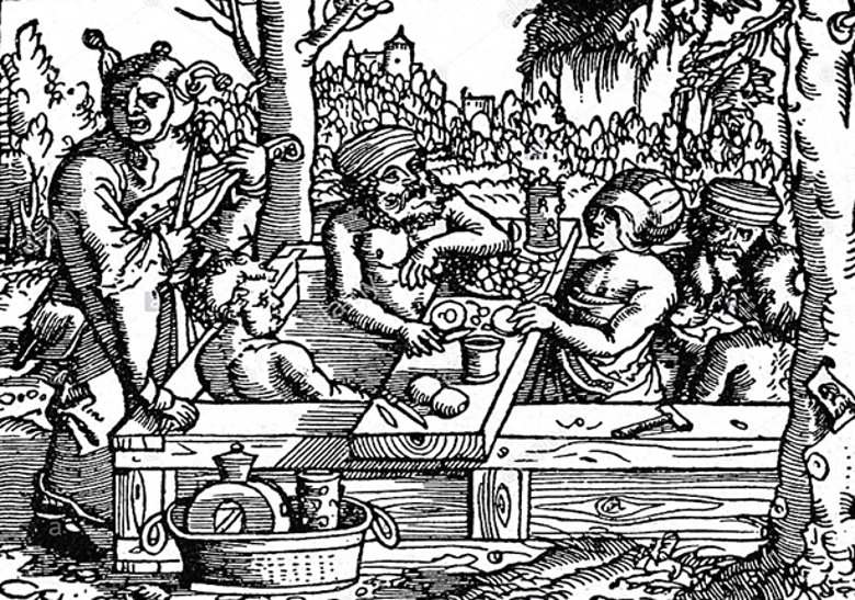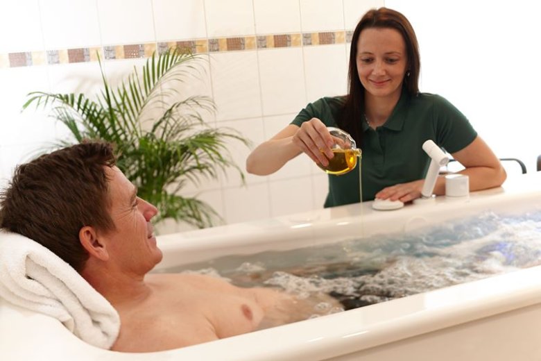 Fotos unten: Badeszene aus dem Mittelalter und von heute (Solebad im Crucenia-Gesundheitszentrum)