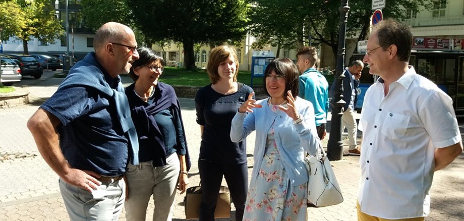 Foto von links nach rechts: Marianne und Thomas Fengler (Dezernent für Ordnung, Bildung und Soziales), Malika Goldt (Stadtführerin), Magdalena Yanshin (Städtepartnerschaften) und Gerd Klier (Vorsitzender der Stadtverordnetenversammlung).