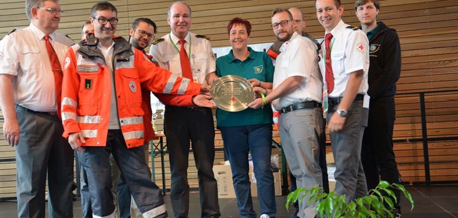 Foto: Übergabe der Rotkreuzerlebnistage 2018 an den DRK-Kreisverband Bad Kreuznach in Bitburg (am Teller links: DRK-Landesbereitschaftsleiter Rainer Hoffmann, mittig: Natascha Fuchß als Leiterin des Jugendrotkreuzes im Kreis Bad Kreuznach und rechts stv. Kreisbereitschaftsleiter Lloyd Fuchß)