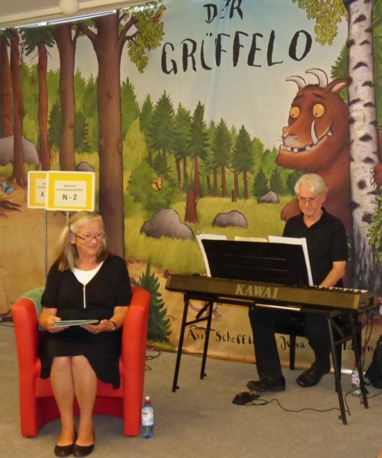 Bei der Abschlussveranstaltung gibt es immer ein kulturelles Beiprogramm: diesmal präsentierten die Schauspielerin Uta Weißkopf und der Musiker Klaus Dreier eine „Grüffelo-Lesung“ (Foto unten). Der PUK-Museumsleiter Markus Dorner zeigte mehrere kurze Puppentheaterstücke unter dem Titel „Kleines Konzert mit großen Puppen“.