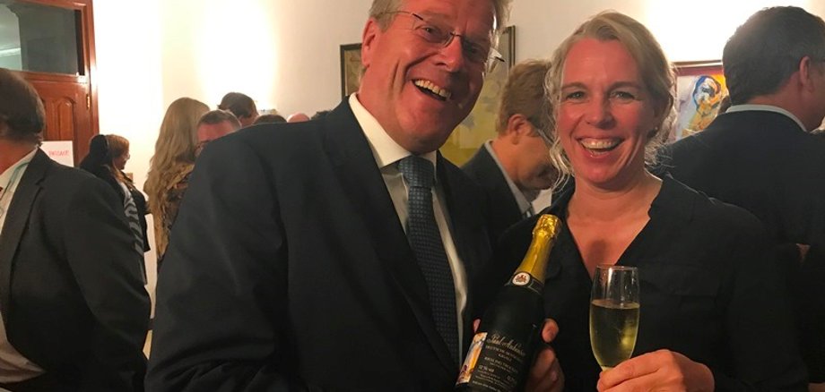 Foto: Einen Winzersekt aus Bad Kreuznach schenkt der deutsche Botschafter in Ruanda, Dr. Peter Woeste, Oberbürgermeisterin Dr. Heike Kaster-Meurer ein.