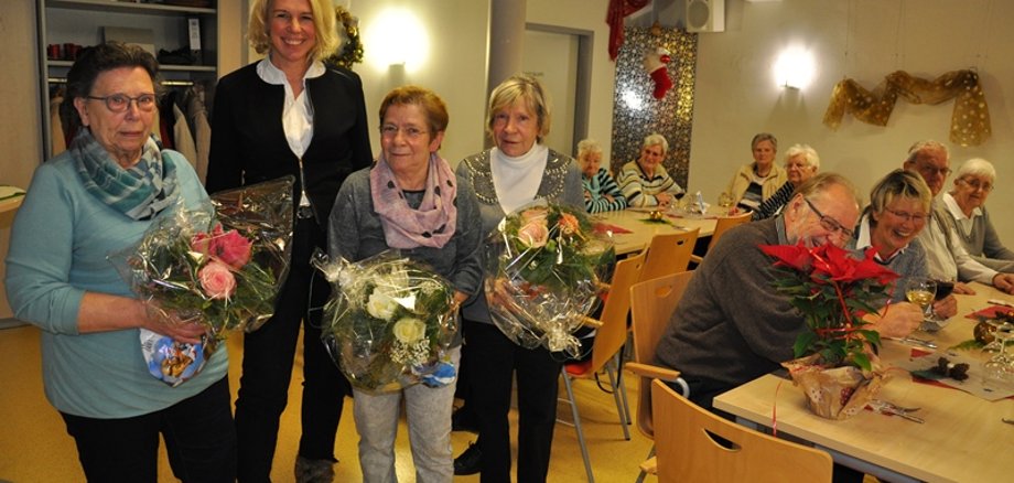 Foto: Blumen als Dankeschön für das ehrenamtliche Engagement überreichte die OB an Emma Holderbaum (links), Hiltrud Weihrauch und Hannelore Grimm.