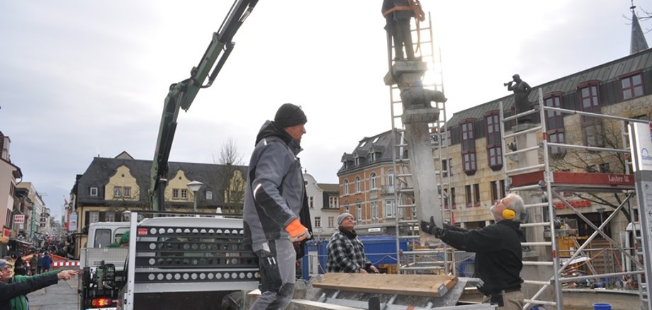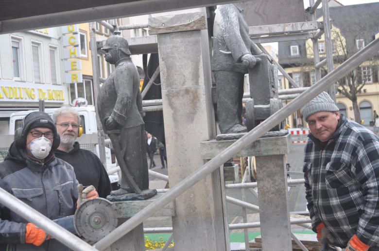 Für Julius Orben hat dieser Auftrag etwas Nostalgisches. Der Seniorchef der Bad Kreuznacher Steinmetzfirma hatte gemeinsam mit dem Künstler Karl Steiner (1908-1984) vor über 40 Jahren die Originale auf dem Brunnen montiert. Die feierliche Einweihung des Originale-Brunnens, gespendet von dem Bad Kreuznacher Kaufmann und Stadtrat Adolf Müller (1891-1969) war am 19. Juli 1975. Die Skulpturen sind noch in einem guten Zustand, sagt der Fachmann Orben: „Sie wurde in einer namhaften deutschen Gießerei hergestellt und haben einen hohen Kupferanteil.“ Gemeinsam mit seinem Sohn Marco überwachte Julius Orben den Abbau der Bronze-Figuren. Übrigens: Die Originale der Originale stehen vor Witterungseinflüssen gut geschützt im Ratskeller der Stadt Bad Kreuznach.