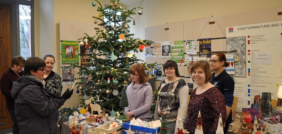Foto: Zum Besuch des Weihnachtsbasars der Lebenshilfe-Werkstätten im Stadthaus lädt Isabelle Merker (rechts) ein. Die Geschenkartikel bieten Tamara Hanzen (links), Stefanie Domehl und Andrea Rodrigues (hinten stehend) an.