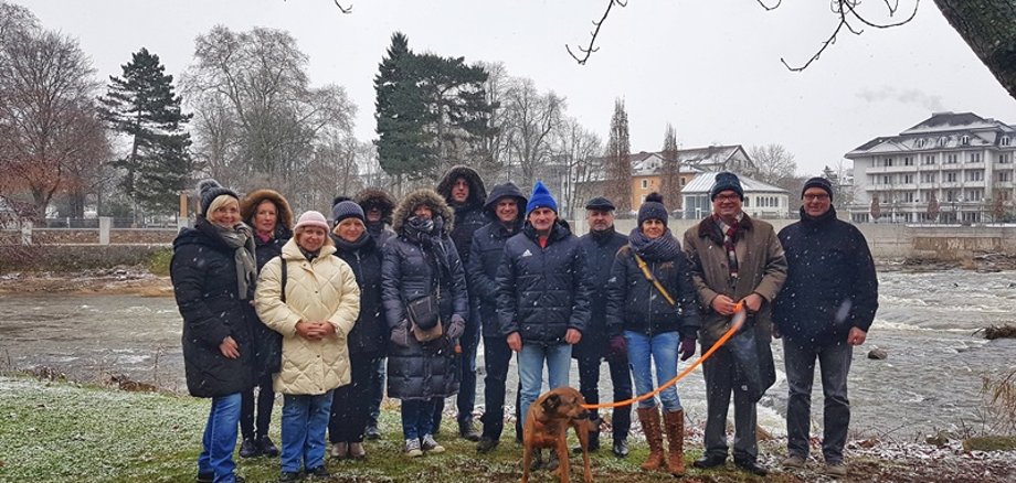 Das Foto zeigt ganz links Gabriele Frijo (RPT), ganz rechts Matthias Hollmann (THV), links daneben Dr. Michael Vesper (GuT) am Sonntag vor der Überquerung des Kauzenbergs Richtung Schloßpark. Leichtes Schneetreiben konnte die Stimmung nicht trüben, schon gar nicht bei der Hündin Susi.