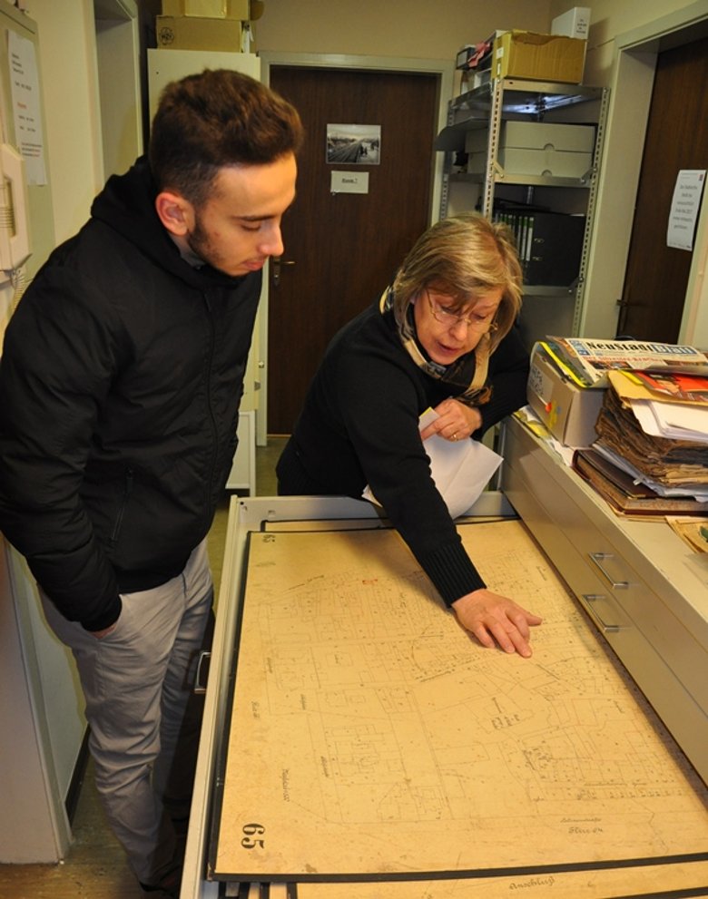 Foto: Eine historische Stadtkarte ließ sich Bamshad Amani von Gabriele Gebhard im Stadtarchiv zeigen.