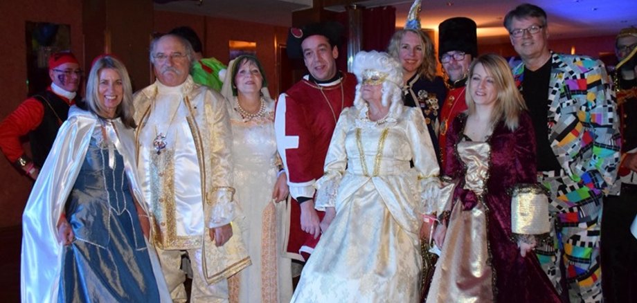 Foto: In prächtigen Kostümen zur Redoute: Christine Simmich, Gérard Lora-Tonet, Martine Desbenoit, Guillaume Lacroix, Charlotte Dominjon, Heike Kaster-Meurer, Günter Meurer, Marie Vincent und Hansjörg Rehbein. Foto: Charlotte Eberwien