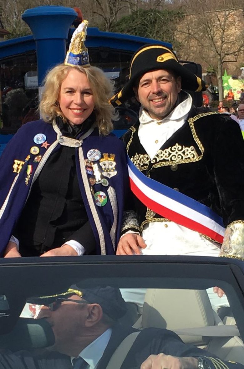 Ihren Bourger Amtskollegen Francois Debat hatte Oberbürgermeisterin Dr. Heike Kaster-Meurer bei der Narrefahrt mit an Bord. Foto: Gérard Lora-Tonet