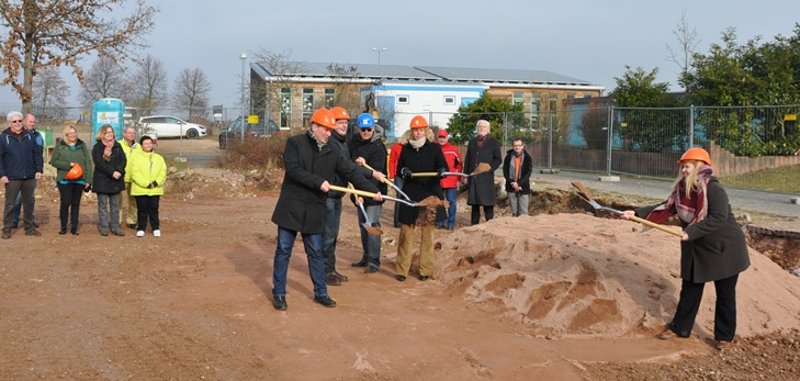 Foto: Klaus Christ, Heinz Schmitt (Statiker aus Wallhausen), Joachim Gerharz (Unternehmen für den Rohbau), Heike Kaster-Meurer und Bianca Romeike (Planung und Bauleitung) beim Spatenstich für das Funktionsgebäude.
