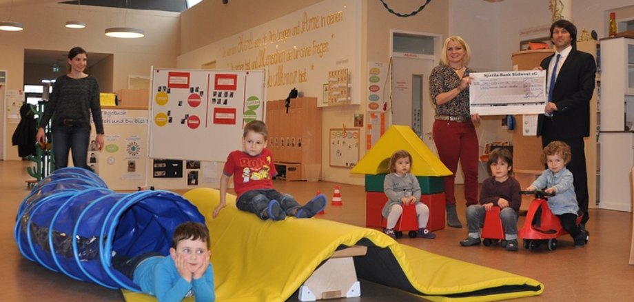 Die Spende wird aus dem Teil der Einnahmen finanziert, der beim Gewinnsparen für gemeinnützige Zwecke verwendet wird, erklärt Florian Faber, der von der Arbeit in der Kita Hannah Arendt begeistert ist. „Unser Sohn freut sich schon am Wochenende, wenn er am Montag wieder in den Kindergarten darf.“ Faber selbst ist aktiver Sportler und spielt für den TuS Winzenheim in der Tischtennis-Verbands-Oberliga. Auch die Erzieherinnen sind sehr sportlich, sagt Verena Wittemann, die Rettungsschwimmerin war.