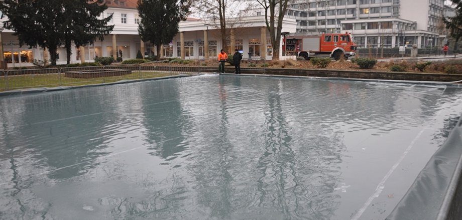 Foto: Der Bauhof wässerte die Folie erneut und hofft, dass die Nachttemperatur tief genug ist, um das Wasser zu einer ausreichenden Eisdecke gefrieren zu lassen.